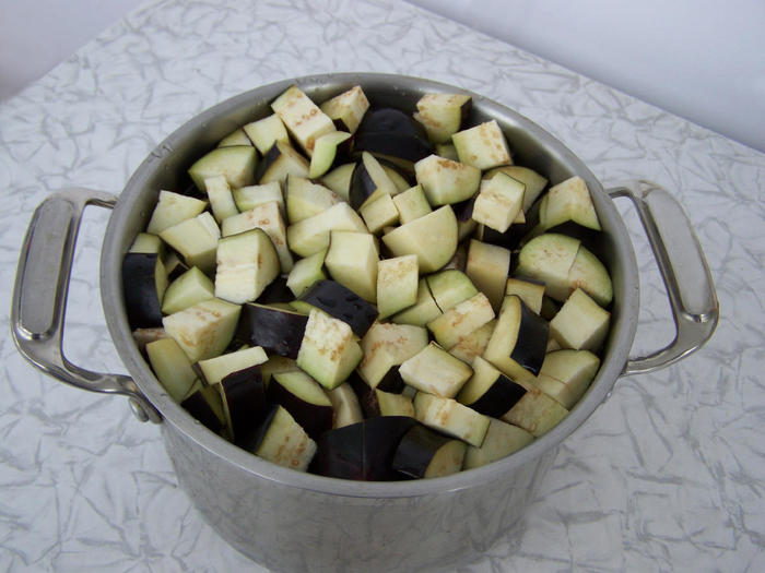 После этого баклажаны необходимо очистить и нарезать кубиками. К измельченным овощам необходимо добавить предварительно пропущенный через пресс чеснок, соль, растительное масло и перец.Компоненты следует тщательно перемешать.