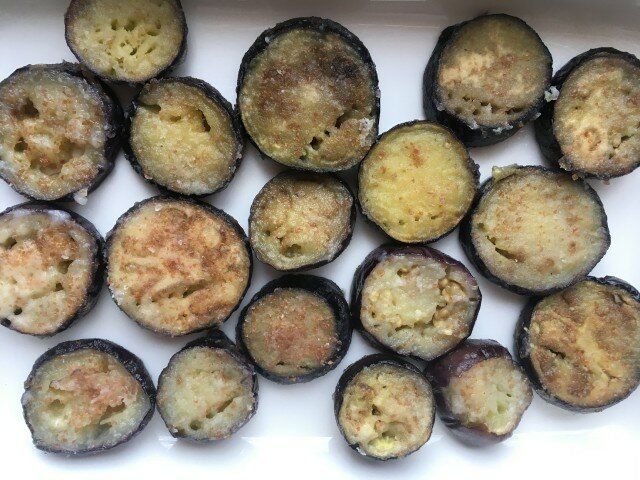 Запекать на максимуме мощности до мягкости. Время будет зависеть от размеров и сорта баклажанов, в среднем уйдет 5-7 минут. Затем тарелку извлечь и поставить под небольшим наклоном. В процессе остывания из них выделится жидкость, с которой уйдет и горечь, часто присутствующая в баклажанах.
