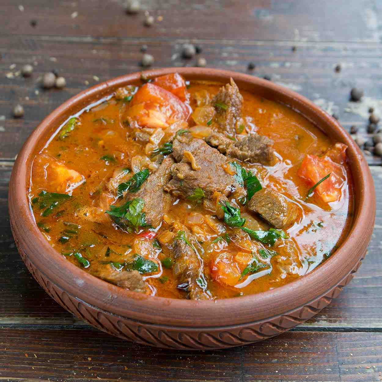 Баранина, тушенная с пряностями КомпонентыМолодая баранина – 1 кг Лук репчатый – 2 шт. Помидоры спелые – 3 шт. Бараний жир – 2 столовые ложки Паприка – 1 столовая ложка Майоран молотый – 1 чайная ложка Базилик молотый – 1 чайная ложка Соль и перец черный молотый – по