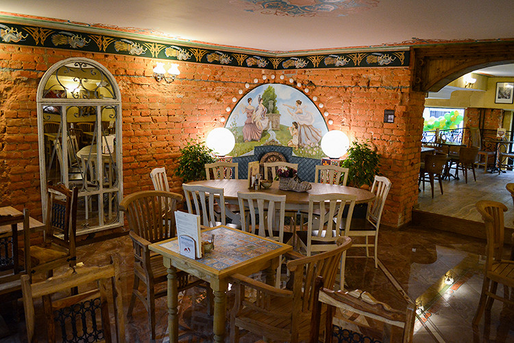 По словам представителей сети, фотографии интерьеров булочной, сохранившиеся в архивах, легли в основу дизайна нового кафе. Сложно в это поверить, потому что интерьер новой двухэтажной пекарни на Тверской — это типичный интерьер сети «Хлеб насущный», его вы узнаете сразу: те же столы, стулья, плитка, цветовая гамма. Единственное отличие — больше дерева на витрине и не согласованные между собой по стилям росписи по стенам и потолку, как говорят в интерьерных журналах — эклектика.