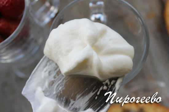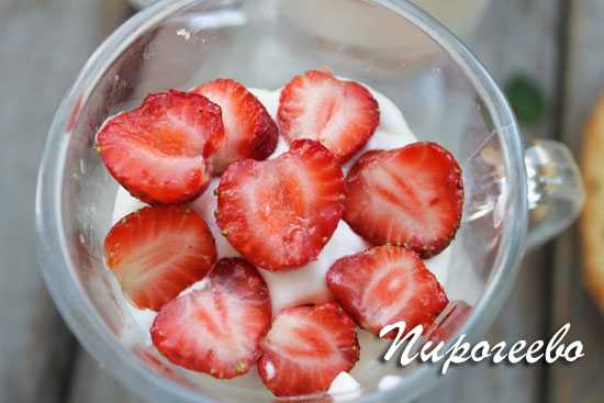 Снова сливки. Помните, что клубнику сливками не испортишь, но ориентируйтесь, конечно, на свой вкус. Возможно, вам захочется положить корж бисквита прямо сейчас.