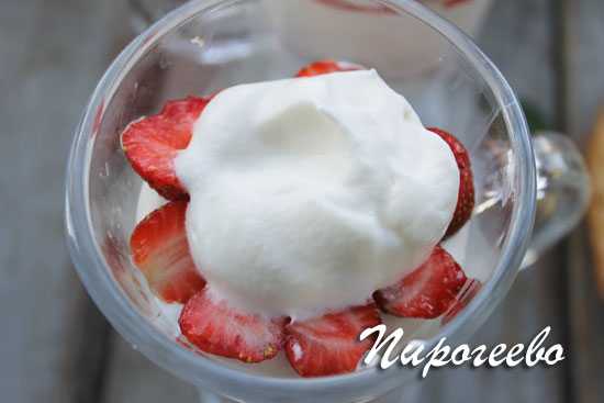 Снова взбитые сливки (2 ст. л.) и свежие ягоды клубники, разрезанные пополам (можно обойтись и без них, но со свежими ягодами гораздо вкуснее).