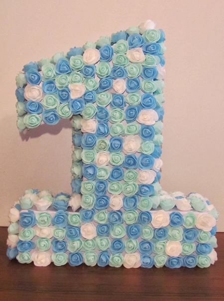 После оклеивания салфеточными цветами получается красивая пышная цифра 1.