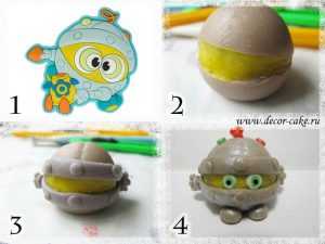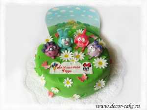 А вот и еще одни популярные мульт герои – смешарики, которые очень просто лепятся из мастики. Вы также можете сделать целый торт в виде одного из смешариков. Вам нужно просто покрыть круглый торт мастикой, а затем на нем сделать мордашку.