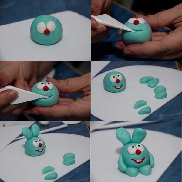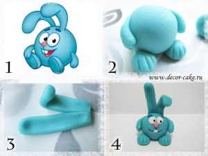 Милый зайка Крош получается у всех детей. Для него нужен пластилин голубого цвета, но хорошо получаются и смешарики из сахарной мастики.