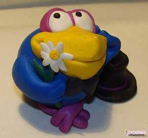 Совунья. Мудрая птичка, которая увлекается спортом и очень любит готовить. Процесс изготовления этой героини очень простой. Из фиолетового пластилина сделайте шарик. Затем прикрепите ушки такого же оттенка и вылепите белые глаза в виде лепёшек, с чёрными точками посередине. Над глазами приклейте фиолетовые веки. Слепите клюв, который должен состоять из двух красных конусов, скреплённых между собой. Сделайте крылья и ножки из чёрного пластилина, после чего присоедините их к туловищу. В конце слепите шапочку с круглым помпоном и прикрепите её на головку Совуньи.