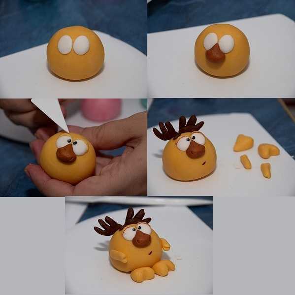 - Скатывают толстенькие ножки и ручки, украшают их красными копытцами.
