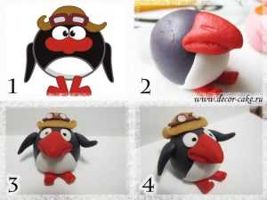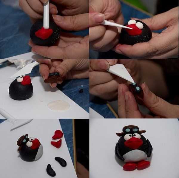 При помощи стека нужно сделать необходимые черты лица. При этом, белой мастикой вы формируете глаза, а при помощи розового, желтого или оранжевого маленького конуса – клюв.