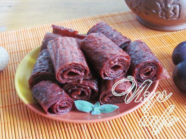 Готовый десерт из яблочного пюре должен быть достаточно пластичнымСладость, приготовленная на основе сливового пюре, получается нежнее, чем яблочная. Благодаря этому ее всегда можно разрезать на полосы и свернуть их в небольшие трубочки. В таком виде заготовку укладывают в банки и герметично закрывают. Емкость хранят на полке кухонного шкафа, если при этом соблюдается температурный режим.