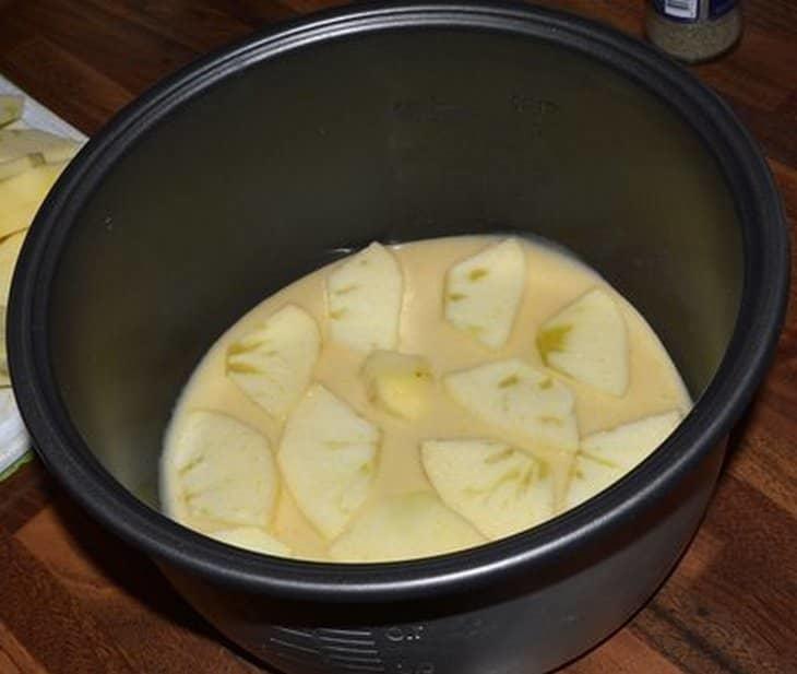 В полученное бисквитное тесто добавляем нарезанные дольками яблоки и всё перемешиваем. Чашу мультиварки хорошо смазываем маслом и выливаем в него тесто.