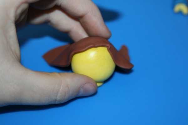 - Приступим к изготовлению головы, для этого скатаем шарик и сделаем небольшой сплюснутый диск. Фиксируем их между собой с помощью воды.