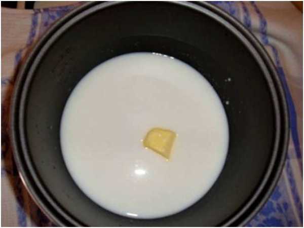 В емкость мультиварки выливаем все молоко и кладем немного сливочного масла.