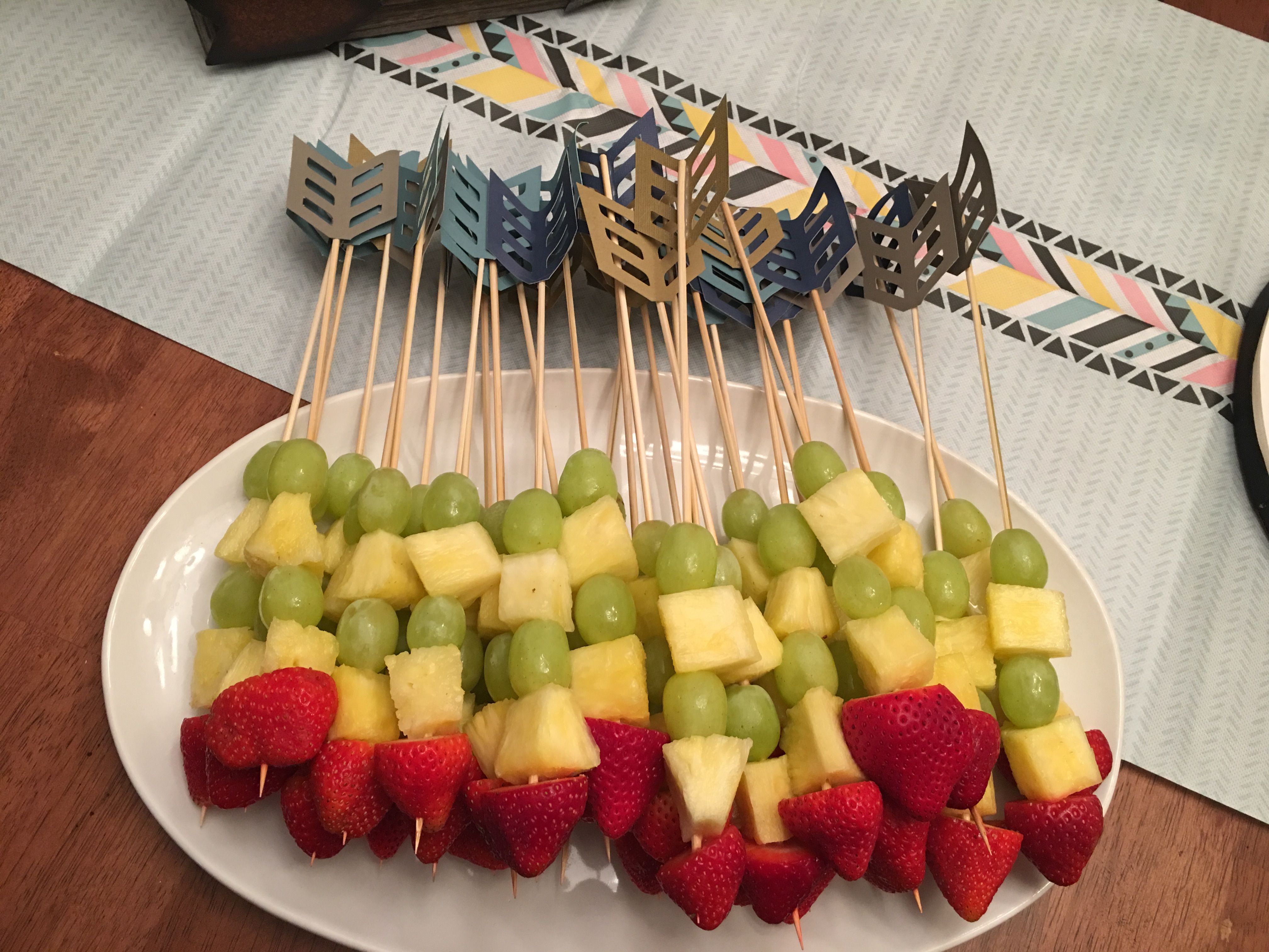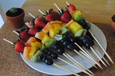 На длинных шпажках нанизывать зеленый и черный виноград, киви, яблоко, дольку апельсина и малину.