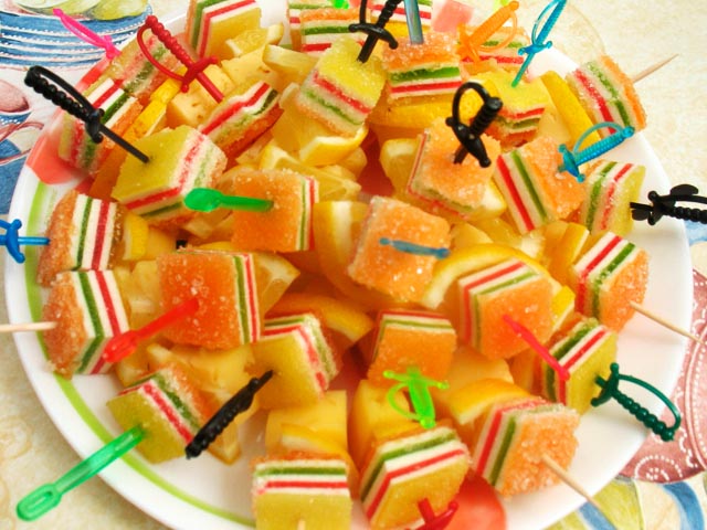 Подобным образом, можно сделать канапе из мармелада, в сочетании с дольками апельсина. Насаживать можно на пластиковые шпажки, или зубочистки.