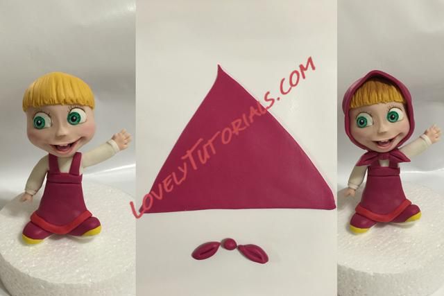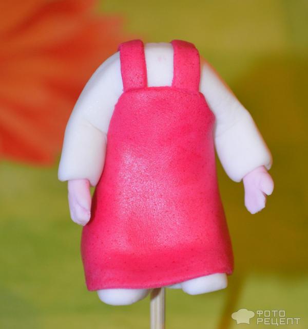 - Раскатайте розовую мастику и приделайте фигурке платье-сарафан с бретелями и косынку.