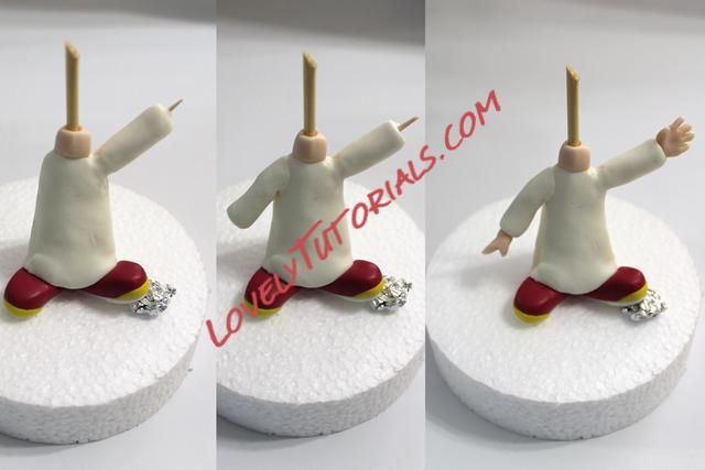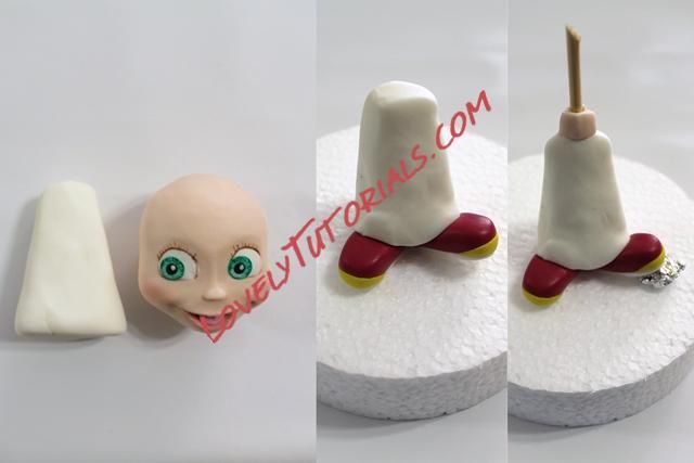 - Тело фигурки будем делать из кусочка фольги, обтянутого белой мастикой. Сверху сделайте имитацию шеи, воткните туда деревянную шпажку и соедините с головой.