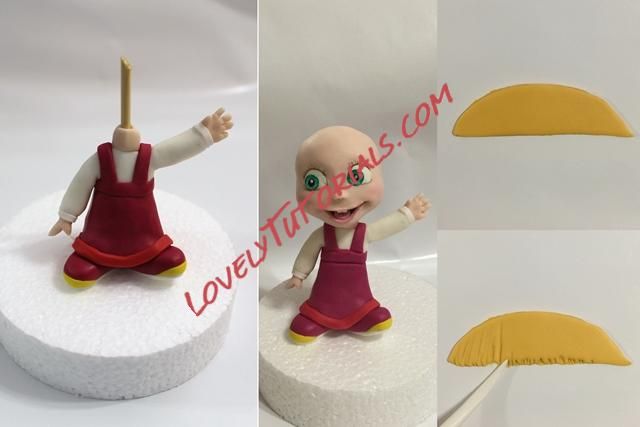 - Из большого пласта желтой мастики вырежьте овал и сделайте Маше челку.