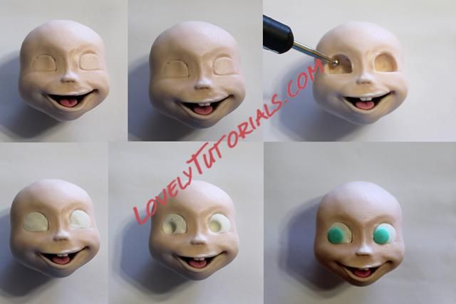 - Два белых шарика вставьте в выемки для глаз, аккуратно заровняйте, излишки уберите скальпелем.