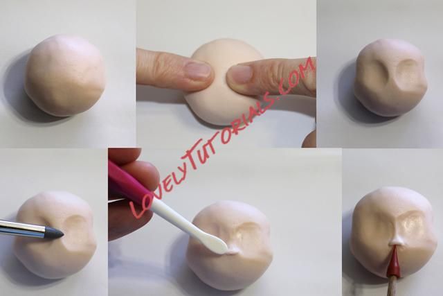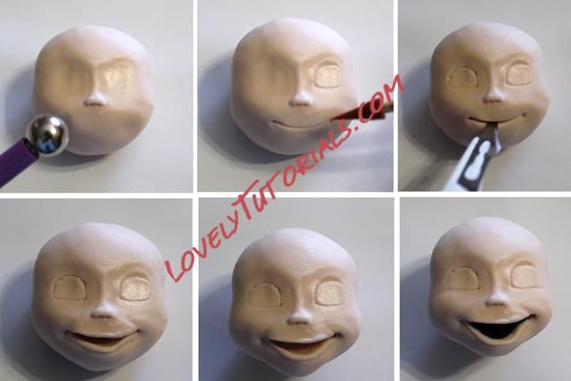 - Начнем формирование фигурки Маши по нашему мастер-классу с головы. Для этого возьмите круглый шарик белой мастики, покрасьте в светло-бежевый цвет, сформируйте лицо – рот, нос, выемки для глаз, подбородок, щеки. Помогайте себе острым скальпелем и стеком с округлым наконечником. Чтобы было легче работать, при выравнивании пальцами смочите их водой, как указано в МК.