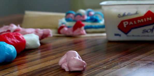 7. Раскрашиваем нашу балерину пищевыми красителями. Телесный цвет получается при сочетании красного, желтого и коричневого. Пробуйте добавлять совсем по чуть-чуть, добиваясь нужного цвета