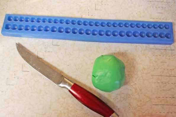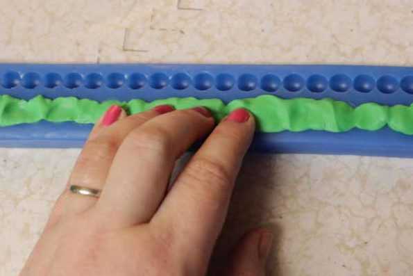 2. Положите мастику на молд и придавливайте ее, чтобы она зашла в форму. Пальцами плотно прижмите ее, чтобы бусинки получились правильной формы.
