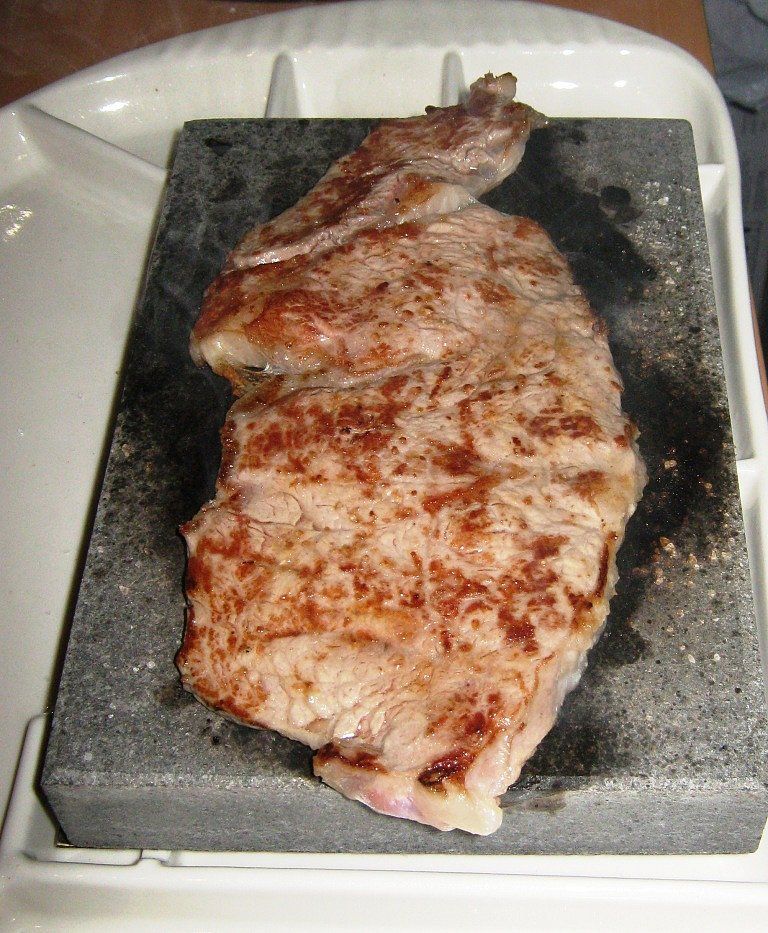 Один мой знакомый друг так восхитился этой весчью, что после посещения ресторана купил такой же камень и отправил родственникас в Россию с подробным объяснением как этим чудом пользоваться.Итак, мясо на камнях. Как говорят французы «plat convivial» — те есть теплое блюдо, способствующее общению и сближению сотрапезников, собравшихся вокруг оного. По сути, аналог костра и спиртного, когда люди собираются вокруг, общаются, выпивают и им становится тепло и уютно, от тепла и алкоголя развязывается язык и общение бежит ручейком.
