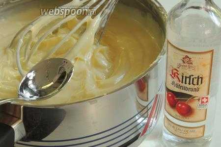 - Остужаем массу до комнатной температуры, вливаем ликер и добавляем маскарпоне, вымешиваем до однородности.