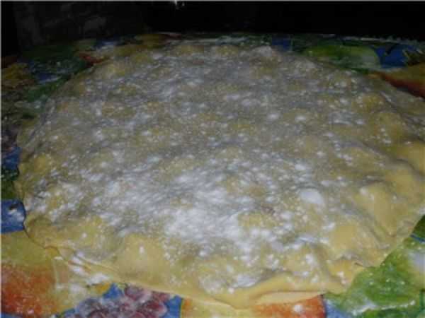 Далее мы накрываем верхним слоем теста и разглаживаем его, выгоняя ненужный воздух.