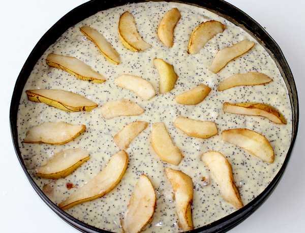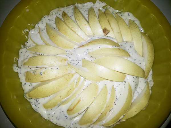 - Тесто перелейте в смазанную маслом форму. Груши нарежьте ломтиками, разложите сверху.