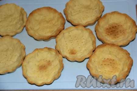 Выпекать при температуре 180-200 градусов примерно 12-15 минут. Ориентируйтесь по своей духовке. Если тесто выложить толстым слоем, то при выпечке оно в серединке может сильно подняться. В таком случае, вы можете через 5 минут после начала выпекания открыть духовку, и, например, рюмкой примять тесто в центре. Готовым корзиночкам дать остыть некоторое время в формочках и затем переложить на решетку.