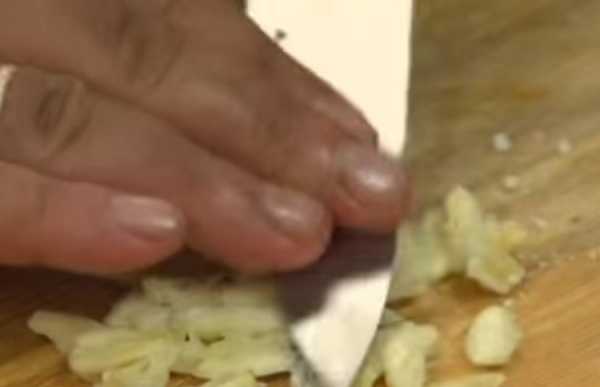 - Чесночные зубчики раздавите плоской стороной ножа, мелко их порубите.