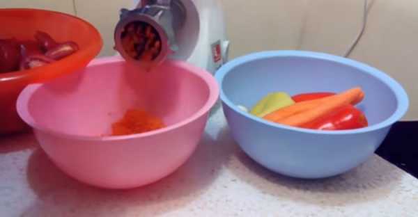 - Морковь, оба вида перца, чеснок и зелень измельчите до состояния пюре любым удобным способом, перемешайте. Если используете хрен, измельчите его вместе с другими ингредиентами.