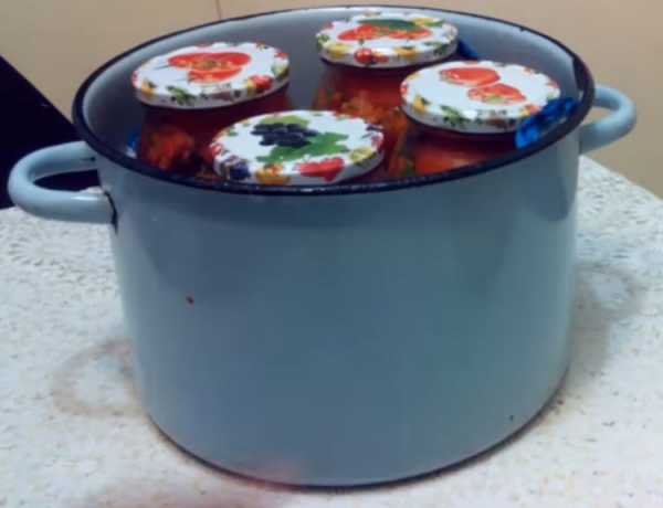 - На дно кастрюли постелите полотенце, поставьте на него банки. Заполните кастрюлю водой, чтобы ее уровень доходил до плечиков банок.