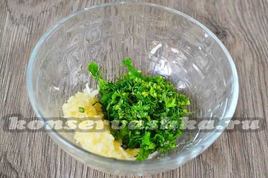 - Соедините зелень, чеснок и перец, хорошо перемешайте.