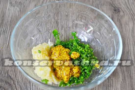 Превращаем в фарш очищенные зубчики чеснока. Для этого используем либо пресс либо мелкую терку. Соединяем все это в одной мисочке.
