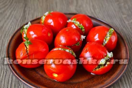 Фаршировать помидоры можно также морковью, болгарским перцем, другими овощами. Зелень выбирают по вкусу. Кроме базилика, кинзы и петрушки берут укроп, мяту, орегано. В сам маринад можно добавить лавровый лист, гвоздику, черный или ямайский перец, листья, смородиновые или вишневые.