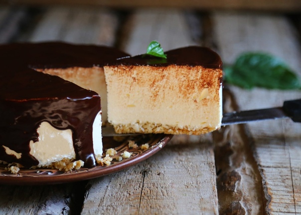 Сверху я полила ганашем, очень нравится мне сочетание птичьего молока с шоколадом! Шоколад залить горячими сливками, размешать до однородной эмульсии, вылить сверху на суфле, распределить равномерным слоем.