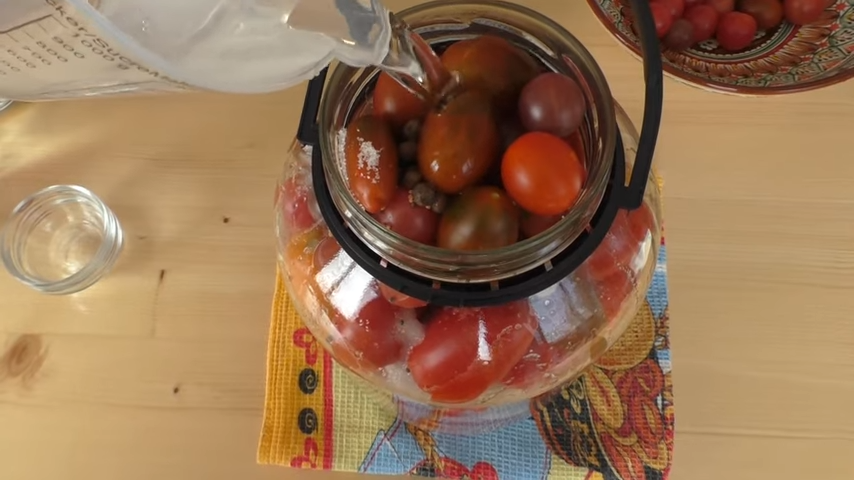 Рассол сливаем и кипятим 5 минут, заливаем помидоры в банке. Через 15 минут сливаем и опять кипятим. Всего процедуру повторяем 3 раза. После последнего раза, остается просто закатать заготовку, перевернуть, накрыть одеялом и ставить остывать, примерно, на 1-1,5 суток.