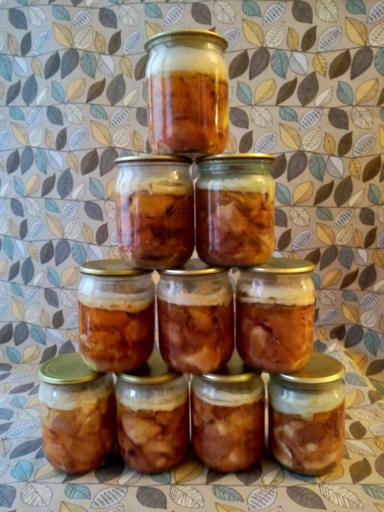 Неплотно накрывают крышками и ставят стерилизоваться в широкую кастрюлю, где уровень воды доходит до плечиков банок. Доводят до кипения. Затем томят на небольшом огне 5-6 часов, при необходимости подливая горячую воду. Выключают, закручивают, переворачивают, утепляют банки и оставляют охлаждаться.