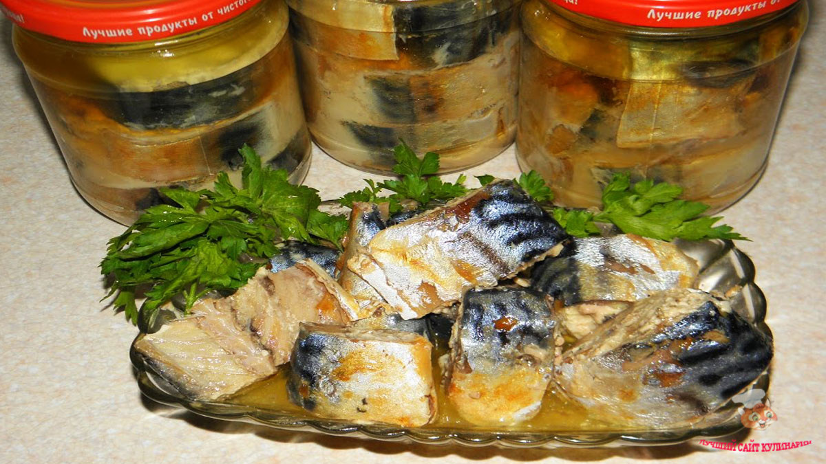 После кипячения или другой стерилизации на дно горячих банок разложить лавровые листики и горошины перца. Плотно уложить рыбу. Банки прикрыть крышками или фольгой, поместить в духовку, нагреть до 150°, затем уменьшить нагрев до 100 и томить 5 часов. Под решётку с банками можно поставить поддон или противень с водой.