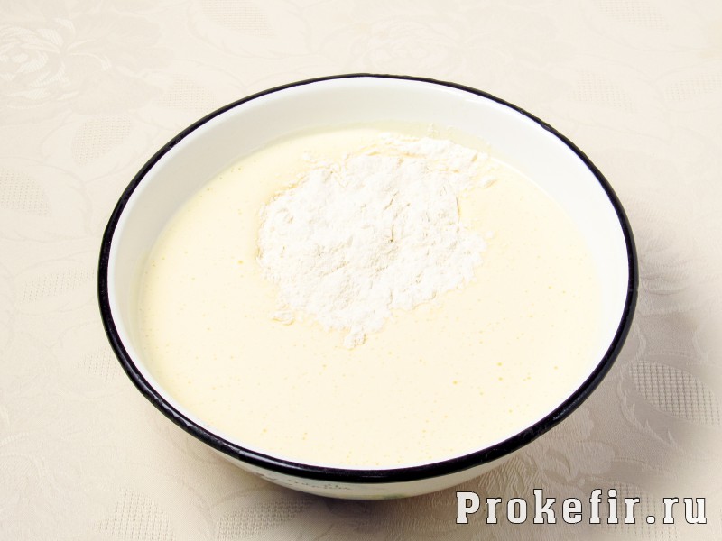 Соединяем яйца с 200 граммами сахарного песка и взбиваем миксером, пока яичная пена не станет плотной, с устойчивыми пиками. Вливаем кефир.