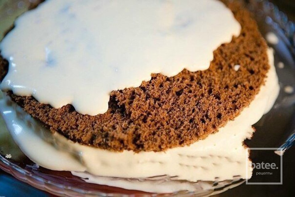 Приступаем к сборке торта. Укладываем их поочередно (черный/белый). Каждый корж обильно смазывается кремом. Немного крема надо оставить для украшения боковых частей десерта.