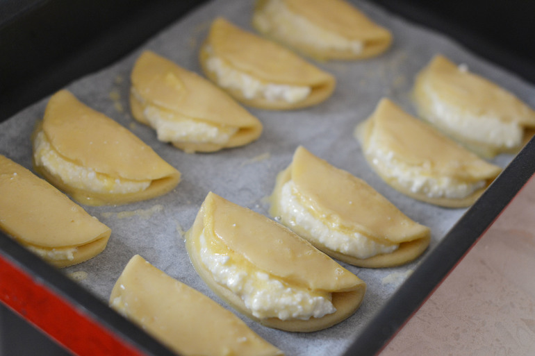 Выложить сочни на смазанный маслом противень и смазать яйцом или яичным желтком.