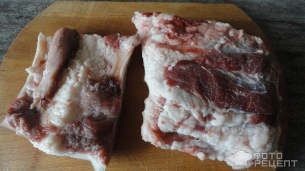 Свиную пашину помыть и промокнуть салфетками, чтобы избавится от влаги. Осмотреть ее на наличие мелких косточек (такое тоже может быть), хрящей и грубых прожилок. Если что-то из выше перечисленного было обнаружено, срезать его.