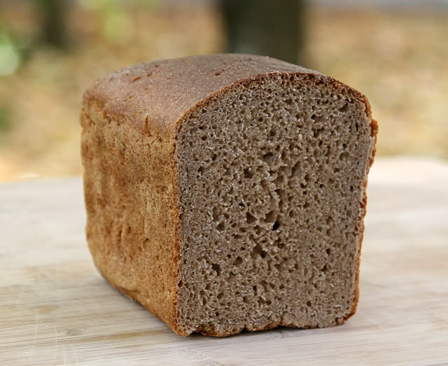 У меня одновременно вывелась ржаная закваска Сарычева-2 и почтальон принес мешок новой для меня муки из США — Ramsey medium rye flour, milled by Ardent Mills. Так что я испекла пробный хлеб, чтоб одновременно оценить как муку, так и качество закваски. Хлеб я пекла ночью, так что утром от него остались рожки да ножки, ибо я позже всех в доме встаю и кое-кто им плотно позавтракал и довольно повилял хвостом. Потому фотографии полного кирпичика при дневном свете у меня нет. Ещё один испеку, покрасивше и покрупнее.