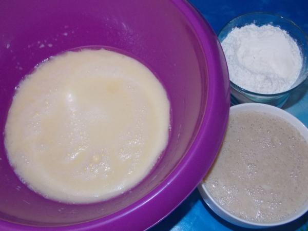 - Отдельно в миске смешиваем подогретую сыворотку со взбитым яйцом, солью, маслом и маргарином, согласно рецепту.