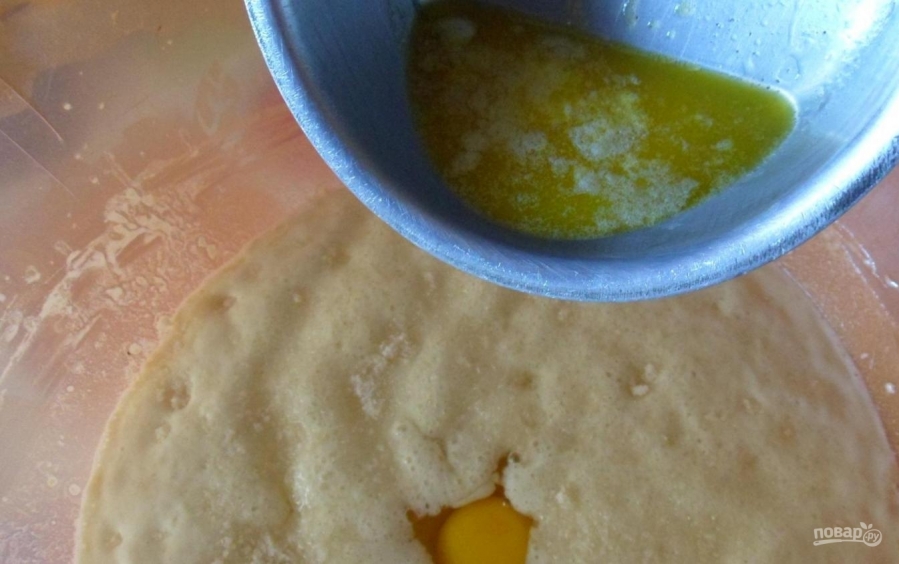 Добавить к сыворотке растопленное сливочное масло, подсолнечное масло и взбитые яйца с сахаром. Перемешать.Шаг 2: