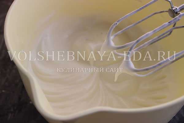 - В отдельной чистой посуде миксером с чистыми насадками взбиваем белки с оставшимся сахаром (90 гр.) до образования жестких пиков (белки не должны выпадать из миски если ее перевернуть вверх дном).