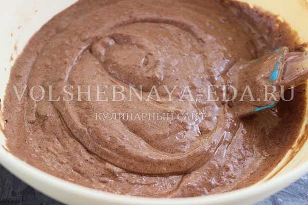 - Затем в эту массу вводим растопленный шоколад и с помощью лопаточки аккуратными складывающими движениями перемешиваем до однородной массы.