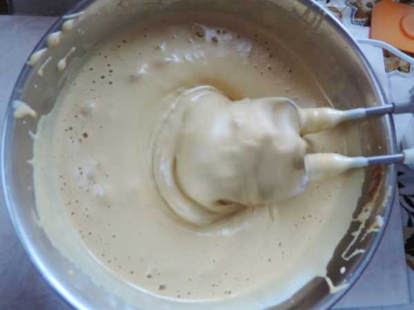 Не прекращая взбивания, вливаем кофейный раствор тонкой струйкой под венчики. Взбиваем до полной однородности. Масса станет воздушной и более жидкой.